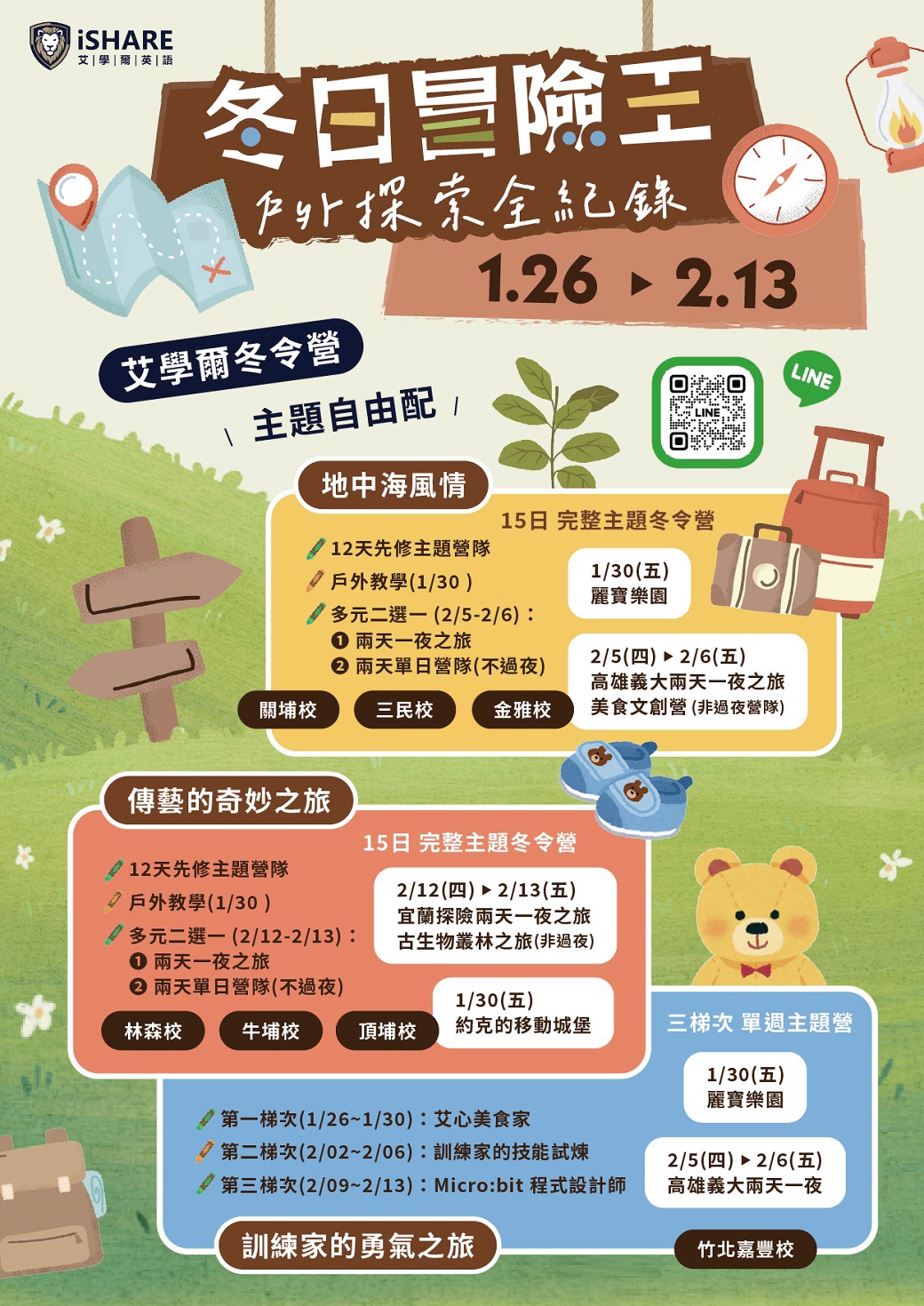 【2026寒假 艾學爾冬令營】冬日冒險王╭。戶外探索全紀錄 商品圖像 商品資訊 !詳細課程規劃與費用,請直接諮詢艾學爾各校! ▼ 各校戶外教學 及 兩天一夜 VS 兩日主題營 行程規劃 ▼ 商品Q&A 提問者稱呼 E-mail 手機 電話 留言內容 驗證碼